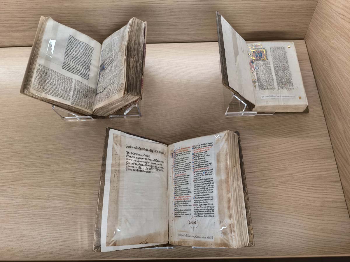 Prezentowana kolekcja rozpoczyna się od tomu Numer jeden z najstarszego zbioru biblioteki Świętego Konwentu w Asyżu: niezwykle cennego inkunabułu Księgi Rodzaju (dar św. Ludwika IX, króla Francji, z połowy XIII wieku). Kończy się zaś w sali poświęconej literaturze franciszkańskiej, ze starożytnymi kodeksami, które przytaczają Pieśń słoneczną i opowiadają o okolicznościach powstania tego wspaniałego dzieła literatury franciszkańskiej napisanego w ludowym języku włoskim. Artefaktom książkowym towarzyszą teksty i interaktywne narzędzia, które skupiają uwagę zwiedzających na szczególnie interesujących informacjach.
