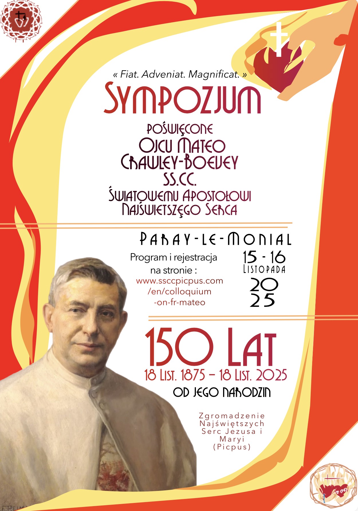 18 listopada br. przypada 150. rocznica urodzin jednego z największych apostołów Najświętszego Serca Pana Jezusa w XX wieku, założyciela Dzieła Intronizacji Bożego Serca oraz Adoracji nocnej w rodzinach – o. Mateo Crawley-Boevey ze Zgromadzenia Najświętszych Serc Jezusa i Maryi (1875-1960). Z tej okazji Zgromadzenie to zaprasza do wzięcia udziału w sympozjum poświęconym Ojcu Mateo, które odbędzie się 15-16 listopada w Paray-le-Monial we Francji.