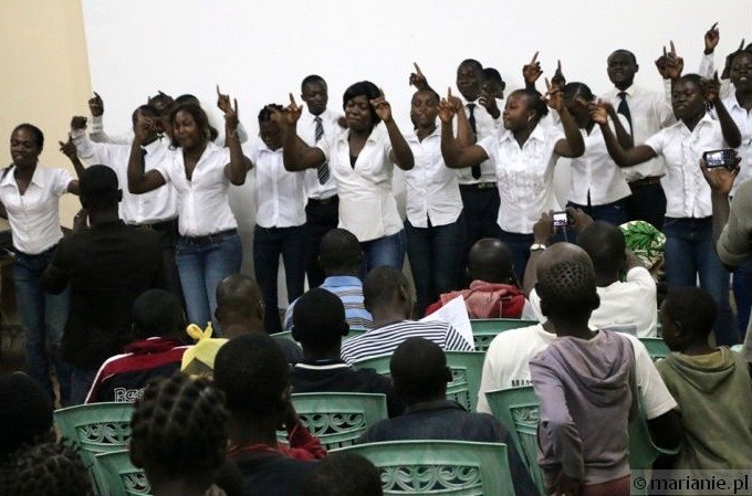 Na tegoroczne afrykańskie Marianki przybyło 106 młodych osób, w tym 20 z sąsiedniej parafii Ayos prowadzonej przez polskich misjonarzy – ojców paulinów i około 10 osób ze stolicy Yaounde, gdzie uczęszczają do szkół. Pozostali pochodzą z naszej parafii. W programie był także przewidziany koncert, na którym urządziliśmy konkurs pieśni o błogoslawionym. Konkurs wygrała młodzież z Ayosu. Późnym wieczorem odbyła się projekcja filmu o świętym Janie XXIII. Najważniejsza jednak była niedzielna Eucharystia. Mszy św. przewodniczył ks. Grzegorz Myłek MIC, rektor naszego Seminarium w Ngoya. Wraz z nim udział wzięli diakon Cyrille oraz seminarzyści Józef, Rogatien, którzy animowali młodzież. Kazanie zaś wygłosił ks. Franciszek Filipiec MIC, który skomentował czytania i wskazując na wybrane osoby jako wzorce do naśladowania: Zmartwychwstałego Chrystusa objawiającego się jako Droga, Prawda i Życie; Tomasza, który powątpiewał w prawdziwość zmartwychwstania, ale dzięki osobistemu spotkaniu z Chrystusem wyznał swoją wiarę „Pan mój i Bóg mój”; Filipa z początku entuzjastę przyciągającego do Chrystusa Natanaela oraz Greków, którzy chcieli go zobaczyć, lecz powątpiewającego przy rozmnożeniu chleba. W drugiej części wspomniał błogosławionego ojca Stanisława Papczyńskiego, który potrafił w wielu trudnościach, jakie spotykał w życiu, znaleźć rozwiązanie i siłę do kroczenia naprzód. Jego mocą był Chrystus i Maryja w tajemnicy i przywileju Niepokalanego Poczęcia. W trakcie homilii młodzież odpowiadała pieśniami, które zostały skomponowane na tę okazję. Na koniec Mszy św. ks. Grzegorz poinformował zebranych o procesie kanonizacyjnym ojca Stanisława Papczyńskiego. Liturgia niedzielna trwała trzy godziny i zakończyła się przemarszem młodzieży przez miasto. Służby porządkowe zatrzymały na drodze samochody, a młodzież śpiewając pieśni, grając na trąbach, wybijając rytmy na bębnach i fanfarach dawała świadectwo swej wiary oraz przynależności do Chrystusa, a także miłości do ojca Papczyńskiego. Na czele marszu młodzież niosła obraz błogosławionego założyciela naszego Zgromadzenia, zaś wszyscy włożyli specjalnie przygotowane białe koszulki z jego wizerunekiem. Na koniec odbyła się wspólna świąteczna agapa i serdeczne pożegnania.