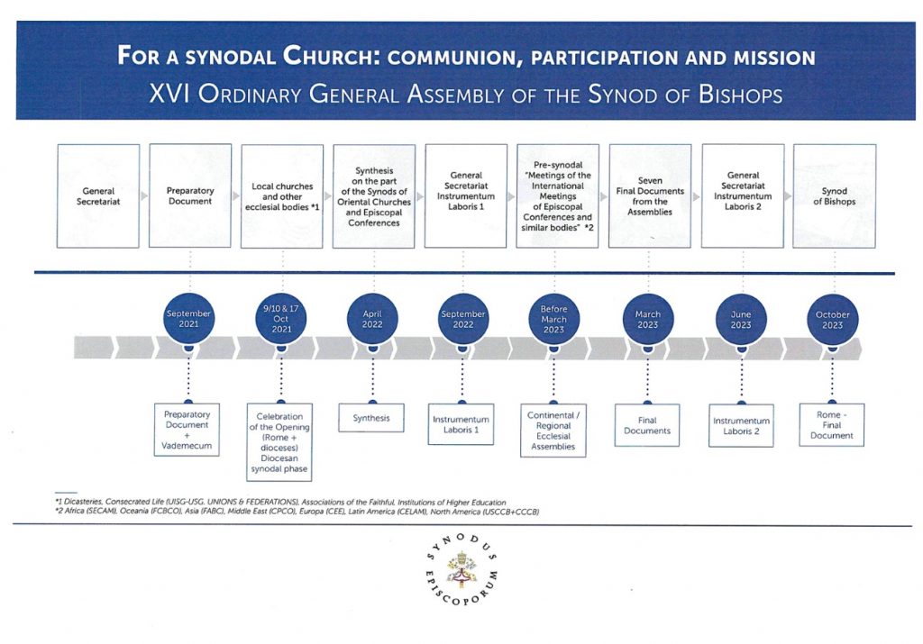 z wielką radością przyjmujemy zaproszenie Papieża Franciszka do podjęcia eklezjalnej drogi, która rozpocznie się 9 i 10 października br., a zakończy się w październiku 2023 r. celebracją najbliższego Synodu Biskupów na temat „Dla Kościoła synodalnego: komunia, uczestnictwo i misja”. W załączniku przesyłamy w języku angielskim infografikę drogi synodalnej, która przedstawia w całości jej przebieg.