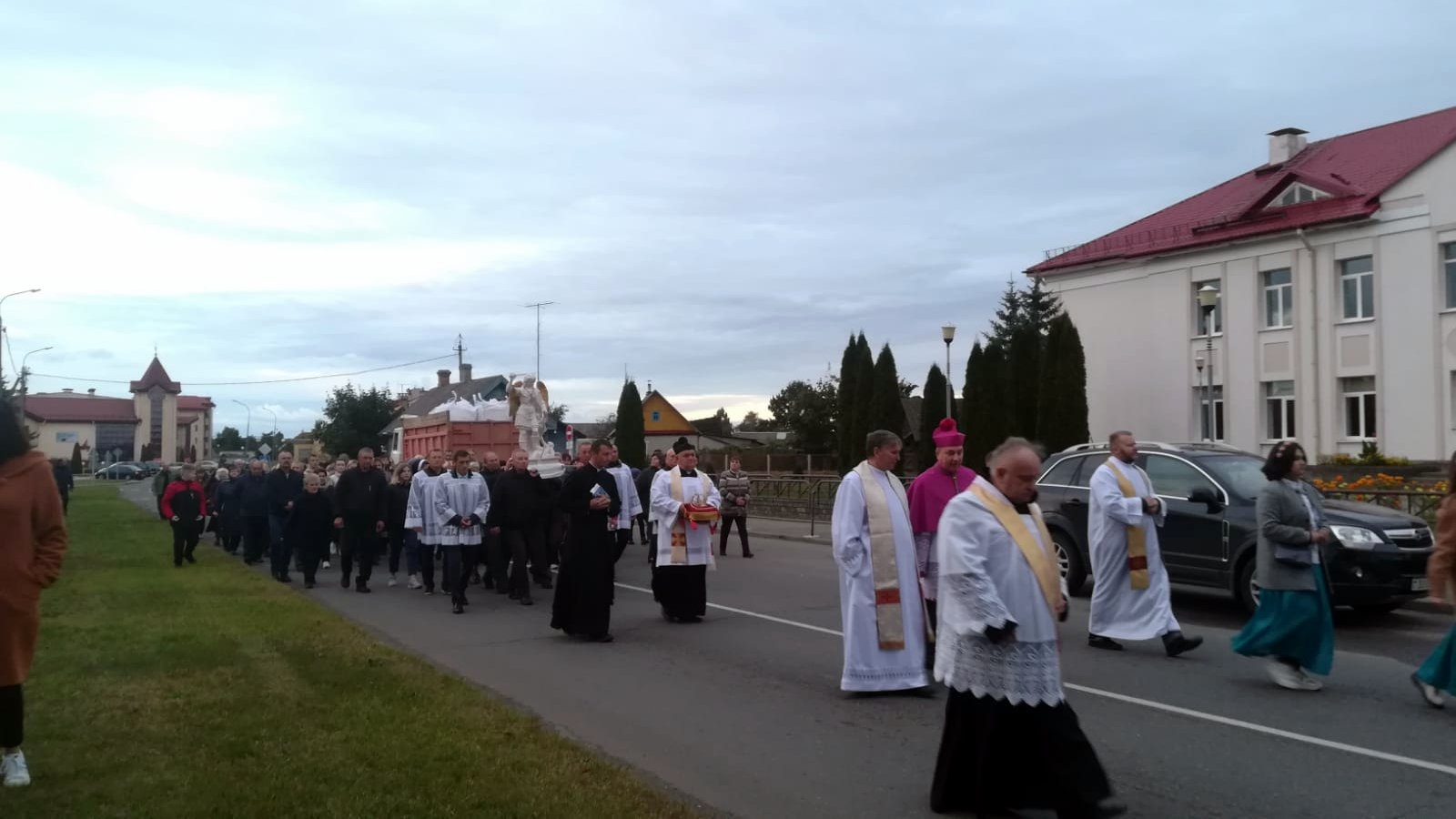 W piątek, tuż przed godziną 19.00 z kościoła w stronę centralnego placu wyruszyła procesja z krzyżem, chorągwiami, orkiestrą dęta, orszakiem blisko 100 dzieci przebranych za anioły, ks. biskupem Jurijem Kasabuckim (biskupem pomocniczym archidiecezji mińsko-mohylewskiej), kapłanami i wiernymi, by powitać tak zacnego Gościa. Po przybyciu do kościoła delegacje dzieci, młodzieży i rodzin, a także ks. proboszcz Stanisław Pytel CSMA wygłosili słowa powitania. Następnie odbyła się uroczysta Msza święta pod przewodnictwem bpa J. Kasabuckiego, a kazanie wygłosił ks. Jan Juszko, przybliżając historię objawień św. Michała Archanioła na Górze Gargano.