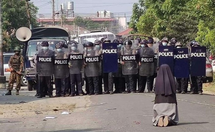 Katolicka zakonnica powstrzymała policję przed atakiem na demonstrantów w mieście Myitkyina, stolicy stanu Kaczin w północnej Mjanmie. Siostra Ann Nu Thawng z diecezjalnego Zgromadzenia św. Franciszka Ksawerego wyszła na ulicę i uklękła przed funkcjonariuszami w pełnym rynsztunku bojowym, błagając ich, by nie strzelali do pokojowo manifestującej młodzieży, wyrażającej sprzeciw wobec wojskowego zamachu stanu. Tego dnia w Mjanmie zabito w całym kraju 18 demonstrantów, a ponad 30 zostało rannych.