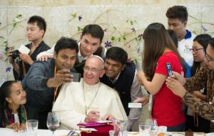 Franciszek został powitany na uczelni wielką owacją zgromadzonych, wśród których była młodzież, nowicjusze, osoby odpowiedzialne za formację duchową i duszpasterstwo młodzieży. Wygłosił improwizowane przemówienie, skupione wokół pocieszenia duchowego – fundamentalnego pojęcia dla jezuickiej duchowości.