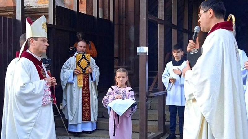 Wydarzenie rozpoczęło się modlitwą różańcową prowadzoną przez najmłodszych parafian. Następnie przed drzwiami kościoła przekazano klucze biskupowi miejsca.