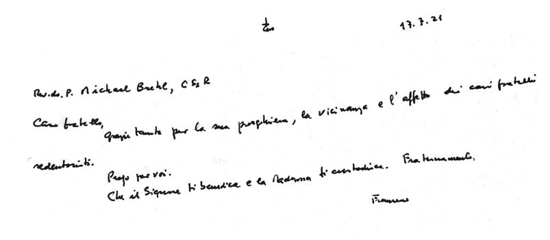 Niedawno otrzymałem tę odręczną notatkę jako odpowiedź od Ojca Świętego. Jak widzicie, dziękuje nam za naszą bliskość z nim, za nasze modlitwy i za naszą miłość do Niego i Stolicy Apostolskiej. Modli się za nas i posyła nam swoje błogosławieństwo.