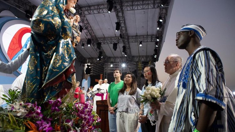 Po odczytaniu Ewangelii o weselu w Kanie Galilejskiej głos zabrał Papież Franciszek, a następnie młodzi modlili się w intencjach Kościoła i świata w różnych językach m. in. po arabsku i koreańsku. Po ceremonii powitania Papież powrócił do nuncjatury. Wzdłuż całej trasy pozdrawiały go tłumy mieszkańców stolicy. W ceremonii powitania udział wzięło ok. 350 tys. osób.