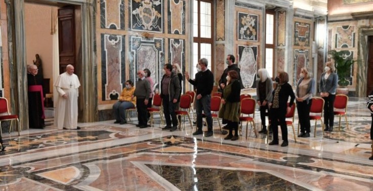 Drodzy przyjaciele, odważnie idźcie w waszej pracy! Proszę Pana, aby was wspierał, bo wiemy, że nasze dobre serca i nasza ludzka siła nie wystarczą. Przed tym, co należy zrobić, i poza nimi, kiedy jesteśmy przed biednym człowiekiem, jesteśmy wezwani do odczuwania miłości, która sprawia, że wydaje się, że jest naszym bratem lub naszą siostrą; i jest to możliwe dzięki Chrystusowi, obecnemu w tej właśnie osobie. Zapewniam was o moich modlitwach, że Pan, za wstawiennictwem świętego Franciszka, zawsze zachowa dla was radość służby. I proszę, ty też, módlcie się za mnie. Dziękuję.