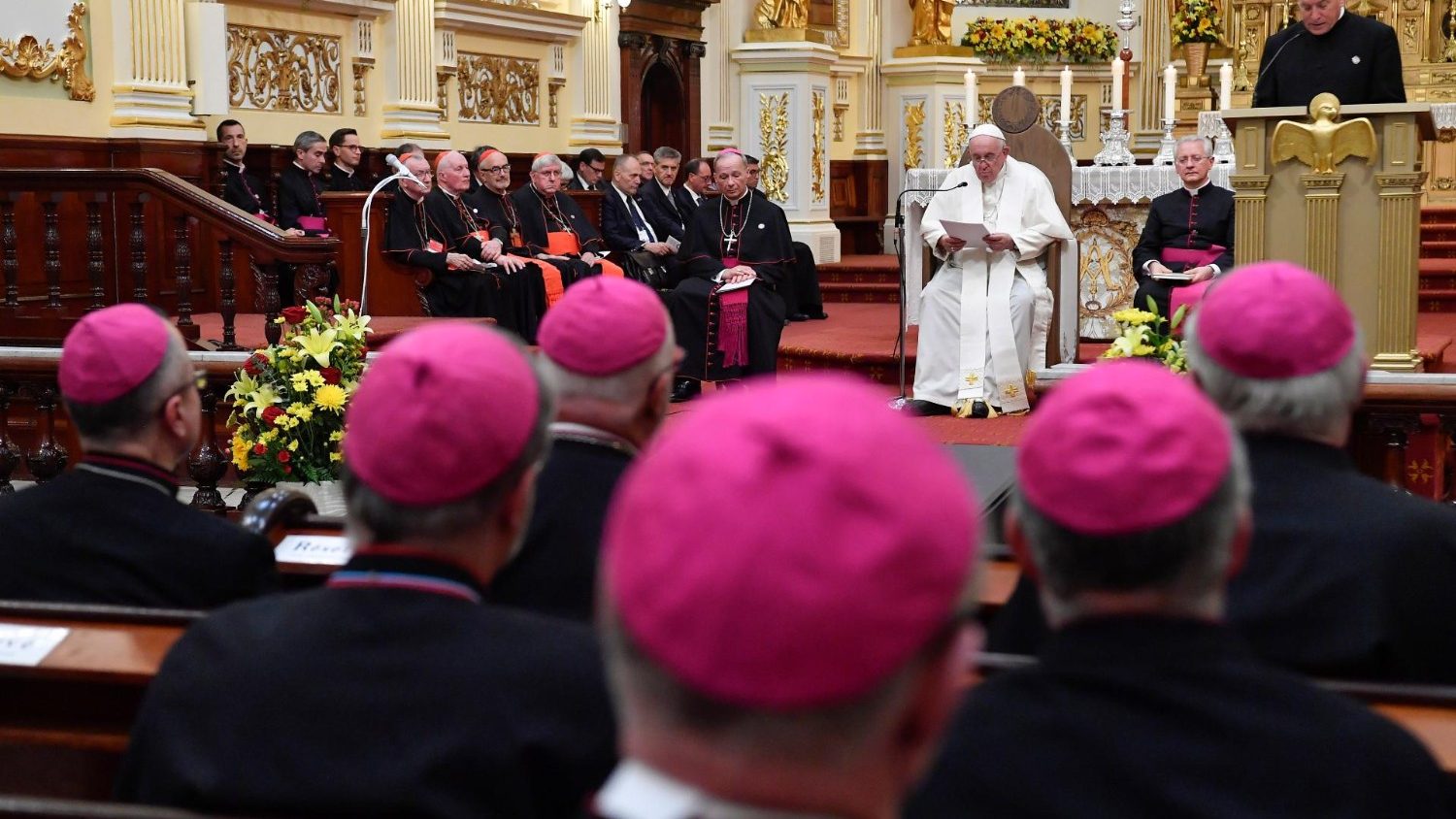 Znamienne jest to, że jesteśmy w bazylice Notre-Dame de Québec. katedrze tego Kościoła partykularnego i prymasowskiej stolicy Kanady, której pierwszy biskup św. Franciszek de Laval, otworzył w 1663 r. seminarium i przez cały czas swojej posługi zajmował się formacją kapłanów. O „starszych”, czyli prezbiterach, mówi wysłuchane przez nas czytanie. Św. Piotr napomina nas: „paście stado Boże, które jest przy was, strzegąc go nie pod przymusem, ale z własnej woli” (1 P 5, 2). Gromadząc się tutaj jako Lud Boży, pamiętajmy, że to Jezus jest Pasterzem naszego życia, który troszczy się o nas, bo nas naprawdę miłuje. Od nas, pasterzy Kościoła, wymaga się takiej samej wielkoduszności w pasterzowaniu trzodzie, aby mogła przejawić się troska Jezusa o wszystkich i Jego współczucie dla ran każdego.