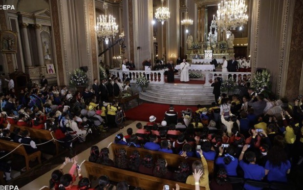 Niezwykle sympatyczny charakter miało spotkanie Franciszka z dziećmi, które przygotowują się do przyjęcia I Komunii św. Miało ono miejsce w katedrze w Morelii. Papież przybył tam po obiedzie w pałacu arcybiskupim.