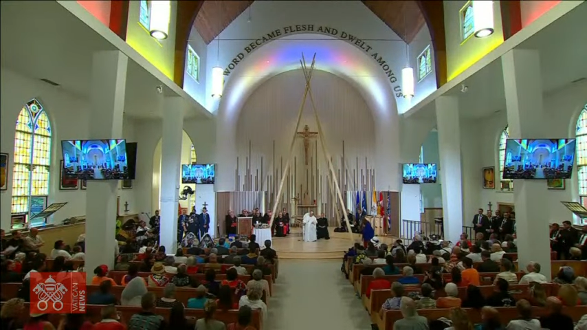 Wiele z tych wyzwań można wyprowadzić z kanadyjsko-indiańskiej spuścizny szkolnego systemu rezydencjalnego, łącznie z tym, którym zarządzał tutejszy Kościół katolicki – zwrócili uwagę mówcy. Podziękowali Ojcu Świętemu „za wysłuchanie naszych głosów, a jego dzisiejsza obecność umożliwia nam zmierzenie się z naszą traumą, zrozumienie jej, uwolnienie się od niej i przejście jej”. Wyrazili też przekonanie, iż kościół Najświętszego Serca, odnowiony niedawno, „będzie służył jako miejsce odnowy i pojednania między autochtonami tej ziemi a tymi wszystkimi, którzy zdecydują się przybyć tu teraz i w przyszłości”.