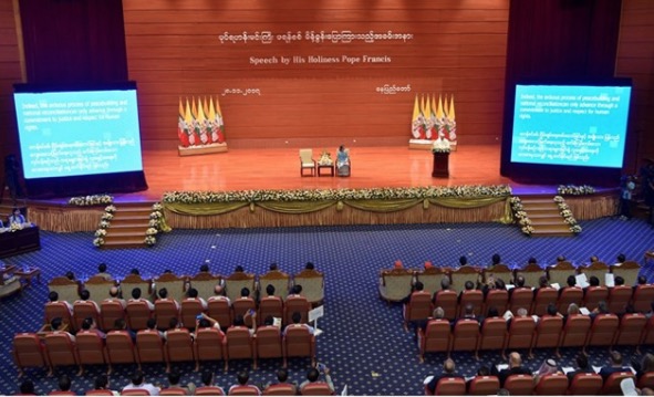 „Birma została obdarzona niezwykłym pięknem i licznymi bogactwami naturalnymi, ale jej największym skarbem są z pewnością jej mieszkańcy. Wiele wycierpieli oni i nadal cierpią z powodu konfliktów wewnętrznych i działań zbrojnych, które trwały nazbyt długo i stworzyły głębokie podziały. Ponieważ naród pracuje obecnie nad przywróceniem pokoju, uzdrowienie z tych ran stanowi podstawowy priorytet polityczny i duchowy” – powiedział Papież.