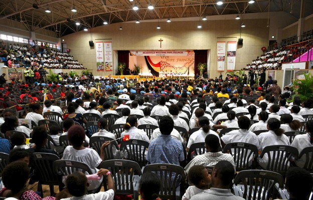 Do kontynuowania ewangelizacji bez zrażania się trudnościami zachęcił papież Franciszek biskupów, kapłanów, diakonów, osoby konsekrowane, kleryków oraz katechistów Papui-Nowej Gwinei i Wysp Salomona. Franciszek spotkał się z nimi w sanktuarium Maryi Wspomożenia Wiernych w Port Moresby.