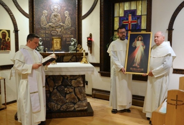 Poświęcenia obrazu dokonał o. Karol Jarząbek, proboszcz parafii Św. Stanisława Biskupa i Męczennika w Nowym Jorku na Manhattanie. Ceremonia ta miała miejsce po wspólnym odmówieniu przez zakonników Nieszporów. W tym akcie poświęcenia wzięli udział wszyscy domownicy klasztoru: o. Jan Kolmaga, o. Michał Czyżewski i br. Anioł Sokalski.