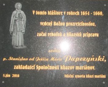 Napis na tablicy, której poświęcenia dokonał Przełożony Wikariatu Czesko-Słowackiego ks. Ryszard Wojciechowski MIC, przypomina, że w tym miejscu u pijarów rozpoczęła się droga życia zakonnego i kapłańskiego późniejszego Założyciela Zgromadzenia Księży Marianów.
