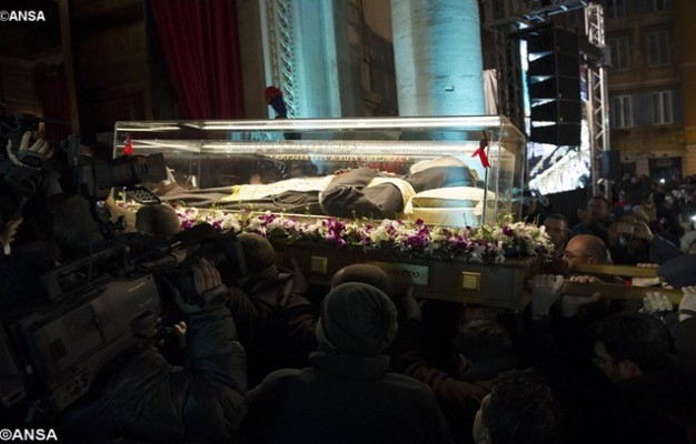 Głównym punktem jej dzisiejszego dnia jest procesjonalne przeniesienie późnym popołudniem ciał obu kapucynów do Bazyliki św. Piotra. Procesja wyruszyła z położonego w centrum Rzymu kościoła Najświętszego Zbawiciela in Lauro, gdzie dotarły one wczoraj wieczorem z rzymskiej Bazyliki św. Wawrzyńca za Murami, do której przywieziono je w środę 3 lutego z San Giovanni Rotondo i z Padwy. W Bazylice Watykańskiej pozostaną 11 lutego. Z tego powodu w przyszły czwartek wyjątkowo nie będzie transmitowanej przez Radio Watykańskie Mszy w języku polskim sprawowanej przy grobie św. Jana Pawła II.