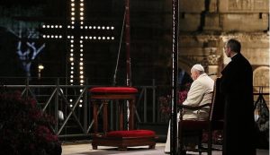 I właśnie pod samym krzyżem chodzi o nasz świat ze wszystkimi jego upadkami i smutkami, jego wezwaniami i buntami, o to wszystko, co woła do Boga dzisiaj, z krajów nędzy i wojny, w rozdartych rodzinach, w więzieniach, na łodziach przepełnionych migrantami…