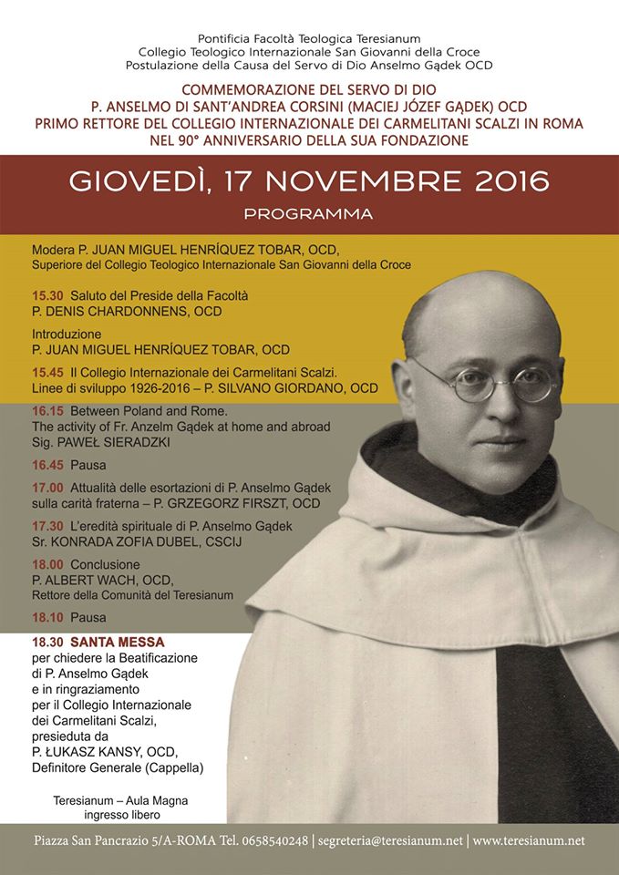 W 25. rocznicę kanonizacji św. Rafała Kalinowskiego, odnowiciela Zakonu karmelitów Bosych w Polsce, 17 listopada 2016 r., odbyła się na prowadzonym przez karmelitów bosych Papieskim Instytucie Duchowości „Teresianum” w Rzymie sesja naukowa poświęcona polskiemu zakonnikowi i kandydatowi na ołtarze, o. Anzelmowi od św. Andrzeja Corsini (Maciejowi Gądkowi) OCD, który 90 lat temu został pierwszym rektorem Międzynarodowego Kolegium Karmelitów Bosych w Wiecznym Mieście, i był nim przez prawie 20 lat.