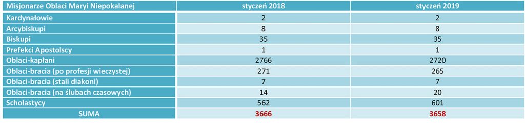 Pomimo faktu, że liczba oblatów-ojców oraz oblatów-braci spadła w zestawieniu z zeszłym rokiem, budzącym nadzieję faktem, jest wzrost liczby oblatów w formacji pierwszej: scholastyków i braci na ślubach czasowych: