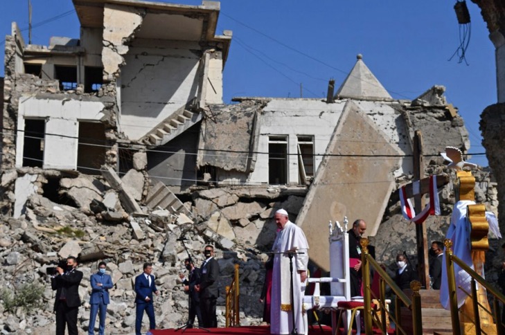 W Mosulu na Placu Czterech Zniszczonych Kościołów w Mosulu papież poprowadził modlitewne nabożeństwo żałobne za ofiary wojny, jaka w latach 2014-2017 toczyła się na tych ziemiach. Ocenia się, że w tym czasie z Mosulu, który w 2004 liczył ponad 1,8 mln mieszkańców, w wyniku agresji Państwa Islamskiego uciekło około pół miliona osób, w tym ponad 120 tys. chrześcijan. Miasto było systematycznie niszczone, a ofiarami tego barbarzyństwa padały liczne kościoły, ale też obiekty muzułmańskie.