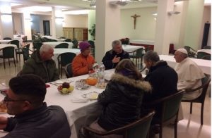 Wybrał on ośmioro bezdomnych (dwie kobiety i sześciu mężczyzn pochodzących z Włoch, Mołdawii, Rumunii i Peru) z grupy osób stojących w kolejce do prysznicy mieszczących się przy Placu św. Piotra. Franciszek najpierw się z nimi pomodlił w kaplicy, a następnie zaprosił do wspólnego stołu i z każdym rozmawiał. Na zakończenie ofiarował im w prezencie tradycyjne argentyńskie słodycze. Specjalne dary, w tym m.in. torty, z okazji papieskich urodzin otrzymują dziś podopieczni wszystkich rzymskich jadłodajni.