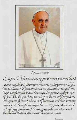„Wszystkim uczestnikom Misyjnych Mszy Świętych Wieczystych z serca hojnie udzielamy naszego Apostolskiego Błogosławieństwa i jednocześnie wyrażamy nasze głębokie uznanie tym, którzy spiesząc z pomocą głosicielom Ewangelii przyczyniają się do rozkrzewiania Słowa Bożego po całym świecie. Wraz z Panem udzielamy wszelkich darów niebios, które niech będą zachętą i pomocą w podejmowaniu zbożnego dzieła.”