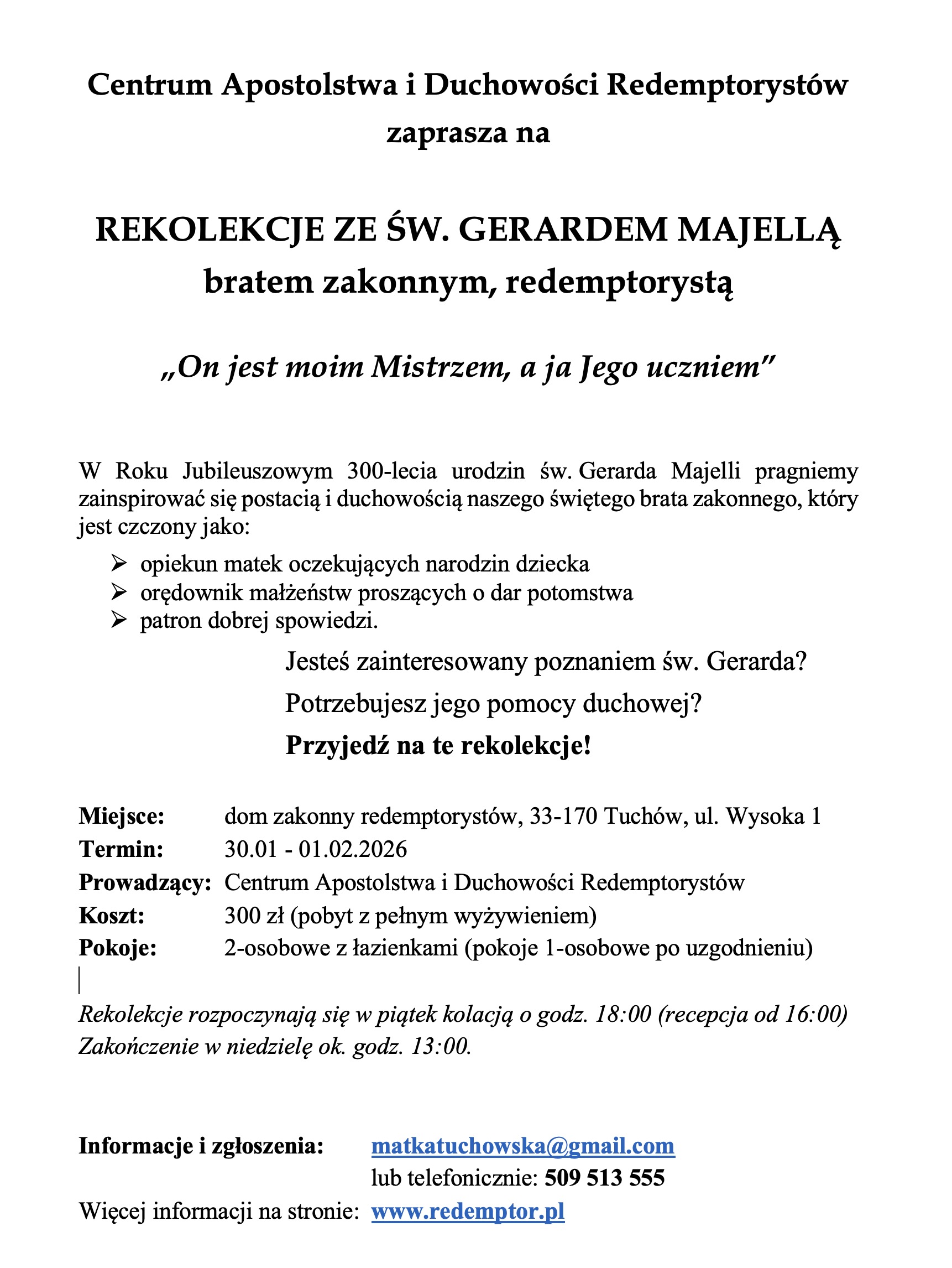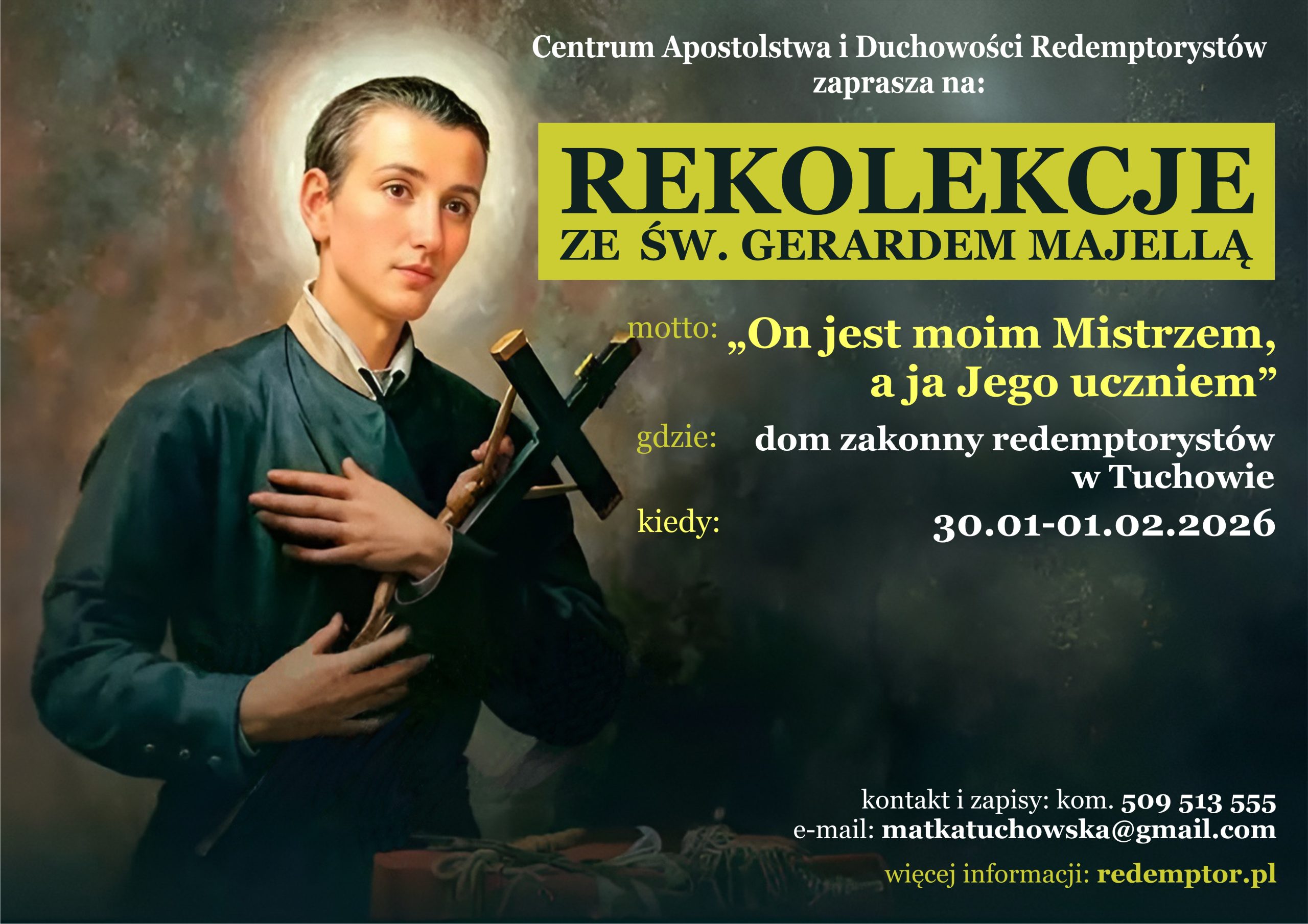 Centrum Apostolstwa i Duchowości Redemptorystów zaprasza na REKOLEKCJE ZE ŚW. GERARDEM MAJELLĄ bratem zakonnym, redemptorystą „On jest moim Mistrzem, a ja Jego uczniem”